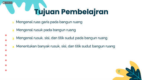 Tujuan Pembelajran 1. Mengenal ruas garis pada bangun ruang 2. Mengenal rusuk pada bangun ruang 3. Mengenal rusuk, sisi, dan titik sudut pada bangun ruang 4. Menentukan banyak rusuk, sisi, dan titik sudut bangun ruang