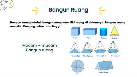 Bangun Ruang Bangun Ruang Bangun ruang adalah bangun yang memiliki ruang di dalamnya. Bangun ruang memiliki Panjang, lebar, dan tinggi. Macam – macam Bangun ruang