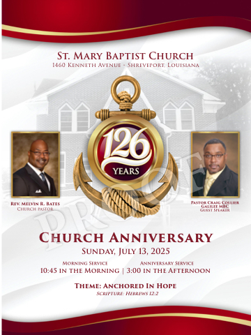 St. Mary Baptist Church 1460 Kenneth Avenue • Shreveport, Louisiana Church Anniversary Sunday, July 13, 2025 Morning Service Anniversary Service 10:45 in the Morning | 3:00 in the Afternoon Theme: Anchored In Hope Scripture: Hebrews 12:2 PROOF