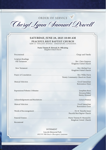 Funeral Oration . . . . . . . . . . . . . . . . . . . . . . . . . . . . . . . . . . . . . . . . . . . . . . . . . Pastor Timmie R. Howard Sr.