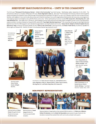 The third year “Shreveport Simultaneous Revival -- Unity in the Community,” was held Sunday – Wednesday nights, September 21-24, 2025. The Simultaneous Revival is a creation of Pleasant Hill’s own, Pastor Reginald G. Reid, Sr., who said, “The Shreveport Simultaneous Revival exists to glorify God by spreading the Gospel of Jesus Christ through the preaching and teaching of His Word. Our aim is to cultivate a spirit of unity among churches, families, and neighbors in our community. We are also committed to investing in non-profit organizations that provide vital resources, encouragement, and ongoing support to strengthen and uplift the Black community.” Other participating churches included Mt. Canaan B.C.; Morning Star, B.C.; and Lake Bethlehem B.C. Each night, from 7-8:30 p.m., participating churches held revival services featuring an evangelist at their church, and afterwards, pastors and their members traveled to Pleasant Hill to attend the “Late Night Worship Experience.” The uniqueness of having the Late Night Worship Experience is that the offerings given were donated to organizations serving the Black community. Pastor John R. Adolph of Antioch Baptist Church, Beaumont, Texas, served as the guest speaker for the “Unity in the Community” opening service, and Pastor Frank Harris, Jr. served as speaker for three nights at Pleasant Hill. Overall, this year’s Simultaneous Revival was second to none!