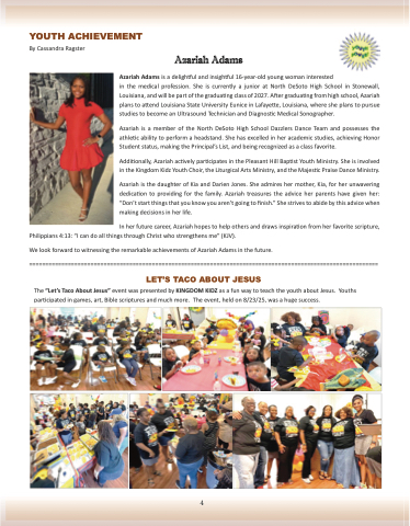 Additionally, Azariah actively participates in the Pleasant Hill Baptist Youth Ministry. She is involved in the Kingdom Kidz Youth Choir, the Liturgical Arts Ministry, and the Majestic Praise Dance Ministry.