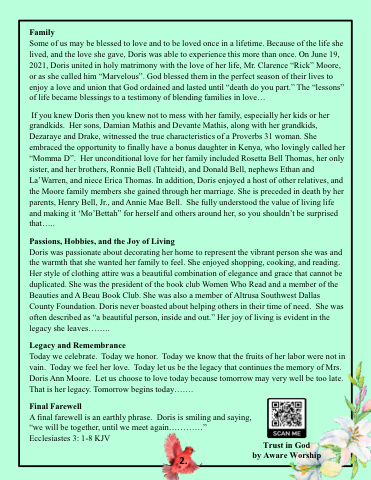 Some of us may be blessed to love and to be loved once in a lifetime. Because of the life she lived, and the love she gave, Doris was able to experience this more than once. On June 19, 2021, Doris united in holy matrimony with the love of her life, Mr. Clarence “Rick” Moore, or as she called him “Marvelous”. God blessed them in the perfect season of their lives to enjoy a love and union that God ordained and lasted until “death do you part.” The “lessons” of life became blessings to a testimony of blending families in love...