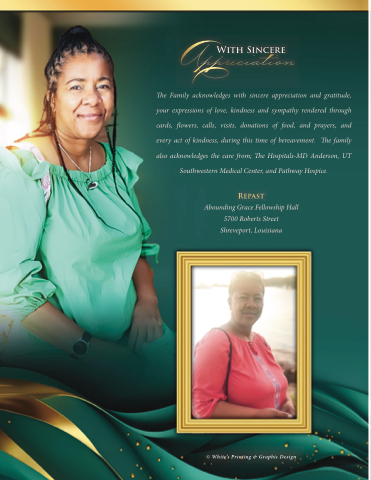 The Family acknowledges with sincere appreciation and gratitude, your expressions of love, kindness and sympathy rendered through cards, flowers, calls, visits, donations of food, and prayers, and every act of kindness, during this time of bereavement. The family also acknowledges the care from; The Hospitals-MD Anderson, UT Southwestern Medical Center, and Pathway Hospice.