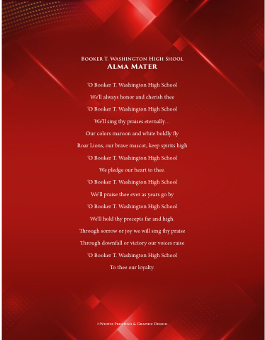Our colors maroon and white boldly fly Roar Lions, our brave mascot, keep spirits high ‘O Booker T. Washington High School