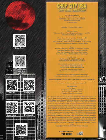 e Horse BackStreet Choppers Magazine (ISSN 1523-8857). 2018 Volume 20 No. 10. e Horse BackStreet Choppers Magazine is published, by e Horse, 51081 Milano Drive, Macomb, MI 48042. All rights in photographic submissions, including, but not limited to, drawings, collages, or any type of submission whatsoever, sent to The Horse will be treated as unconditionally assigned magazine copyright purposes and are subjected to The Horse right to edit, comment, title and departmentalize editorially; and will thereupon become the sole property of The Horse. Payment for unsolicited manuscripts will be made at The Horse discretion. Nothing appearing in The Horse may be reprinted or reproduced in any fashion either wholly or in part without written permission of the Publisher. All hired contractors must complete and sign a valid contract before starting services. POSTMASTER: send change of address to e Horse, 51081 Milano Drive, Macomb, MI 48042. PERIODICALS postage paid at Mount Clemens, MI and additional mailing o ces. e Horse BackStreet Choppers, e Horse Smoke Out, Iron Horse, National Chopper League, ACO, Pro Chop O , Chop O & Ride In Bike Show. Oui and logos are e Horse Trademarks registered through the U.S. Patent O ce.