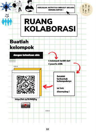 KERJAKAN AKTIVITAS BERIKUT SECARA BERKELOMPOK ! RUANG KOLABORASI Buatlah kelompok dengan ketentuan sbb: 1 kelompok terdiri dari 4 peserta didik Setelah terbentuk kelompoknya isi link disamping ! http://bit.ly/3UN9jDg 10