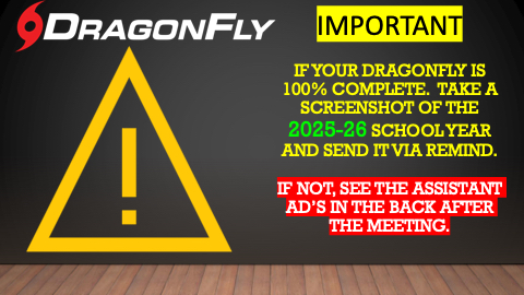 IMPORTANT IF YOUR DRAGONFLY IS 100% COMPLETE. TAKE A SCREENSHOT OF THE 2025-26 SCHOOL YEAR AND SEND IT VIA REMIND. IF NOT, SEE THE ASSISTANT AD’S IN THE BACK AFTER THE MEETING.