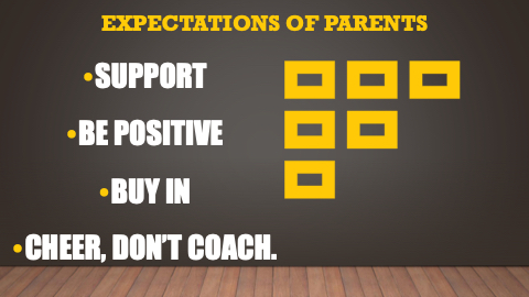 EXPECTATIONS OF PARENTS •SUPPORT •BE POSITIVE •BUY IN •CHEER, DON’T COACH.
