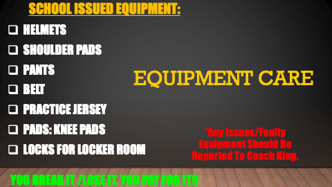 EQUIPMENT CARE SCHOOL ISSUED EQUIPMENT: ❑ HELMETS ❑ SHOULDER PADS ❑ PANTS ❑ BELT ❑ PRACTICE JERSEY ❑ PADS: KNEE PADS ❑ LOCKS FOR LOCKER ROOM YOU BREAK IT /LOSE IT, YOU PAY FOR IT!! *Any Issues/Faulty Equipment Should Be Reported To Coach King.