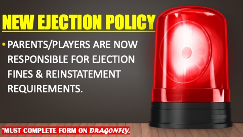 NEW EJECTION POLICY • PARENTS/PLAYERS ARE NOW RESPONSIBLE FOR EJECTION FINES & REINSTATEMENT REQUIREMENTS. *MUST COMPLETE FORM ON DRAGONFLY.