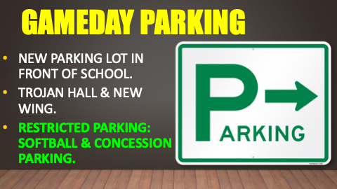 GAMEDAY PARKING • NEW PARKING LOT IN FRONT OF SCHOOL. • TROJAN HALL & NEW WING. • RESTRICTED PARKING: SOFTBALL & CONCESSION PARKING.
