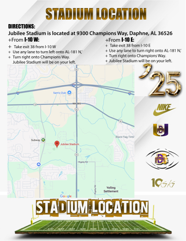 Jubilee Stadium is located at 9300 Champions Way, Daphne, AL 36526