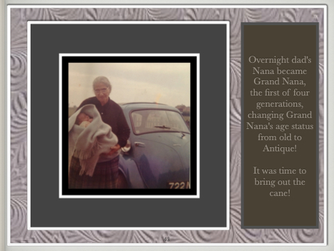 Overnight dad's Nana became Grand Nana, the fi generations, rst of four changing Grand Nana's age status from old to Antique! It was time to bring out the cane! 43