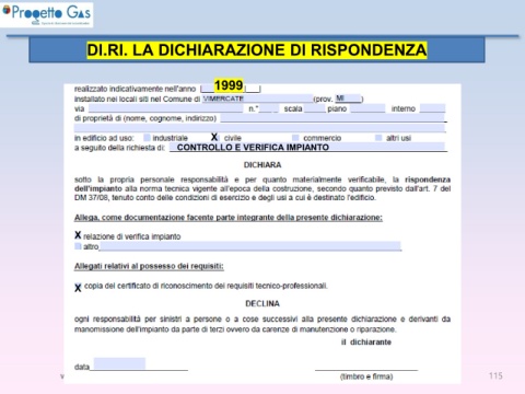 DI.RI. LA DICHIARAZIONE DI RISPONDENZA 1999 X CONTROLLO E VERIFICA IMPIANTO X X www.progettogas.com - Il punto di riferimento del termoidraulico - info@progettogas.com 115