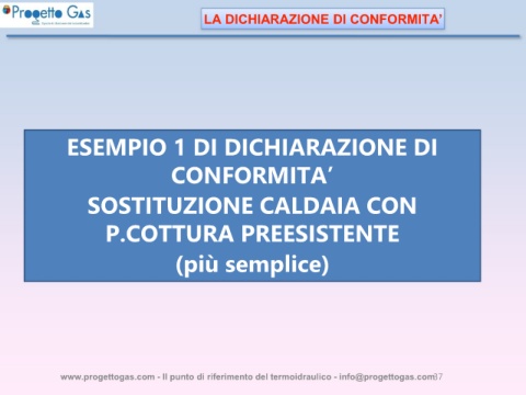 LA DICHIARAZIONE DI CONFORMITA’ ESEMPIO 1 DI DICHIARAZIONE DI CONFORMITA’ SOSTITUZIONE CALDAIA CON P.COTTURA PREESISTENTE (più semplice) www.progettogas.com - Il punto di riferimento del termoidraulico - info@progettogas.com 37