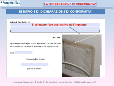 LA DICHIARAZIONE DI CONFORMITA’ ESEMPIO 1 DI DICHIARAZIONE DI CONFORMITA’ Si allegano foto esplicative dell’impianto www.progettogas.com - Il punto di riferimento del termoidraulico - info@progettogas.com 44