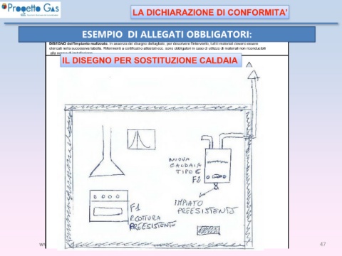 LA DICHIARAZIONE DI CONFORMITA’ ESEMPIO DI ALLEGATI OBBLIGATORI: IL DISEGNO PER SOSTITUZIONE CALDAIA www.progettogas.com - Il punto di riferimento del termoidraulico - info@progettogas.com 47