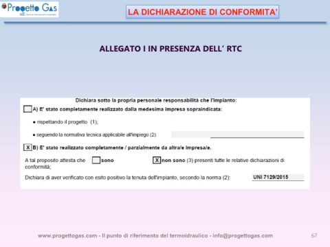 LA DICHIARAZIONE DI CONFORMITA’ ALLEGATO I IN PRESENZA DELL’ RTC www.progettogas.com - Il punto di riferimento del termoidraulico - info@progettogas.com 67