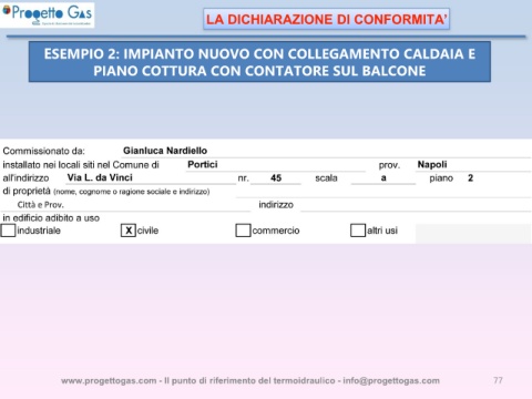 LA DICHIARAZIONE DI CONFORMITA’ ESEMPIO 2: IMPIANTO NUOVO CON COLLEGAMENTO CALDAIA E PIANO COTTURA CON CONTATORE SUL BALCONE www.progettogas.com - Il punto di riferimento del termoidraulico - info@progettogas.com 77