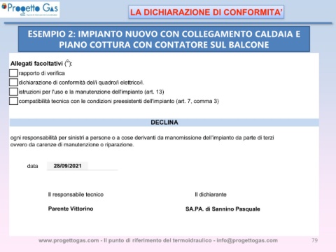 LA DICHIARAZIONE DI CONFORMITA’ ESEMPIO 2: IMPIANTO NUOVO CON COLLEGAMENTO CALDAIA E PIANO COTTURA CON CONTATORE SUL BALCONE www.progettogas.com - Il punto di riferimento del termoidraulico - info@progettogas.com 79