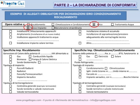 PARTE 2 – LA DICHIARAZIONE DI CONFORMITA’ ESEMPIO DI ALLEGATI OBBLIGATORI PER DICHIARAZIONI IDRO CONDIZIONAMENTO RISCALDAMENTO www.progettogas.com - Il punto di riferimento del termoidraulico - info@progettogas.com 94