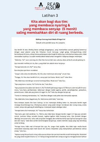 Latihan 3 Kita akan bagi dua tim: yang membaca nyaring & yang membaca senyap (5 menit) saling memisahkan diri di ruang berbeda.