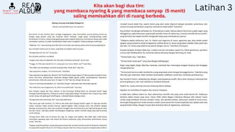 Kita akan bagi dua tim: Latihan 3 yang membaca nyaring & yang membaca senyap (5 menit) saling memisahkan diri di ruang berbeda.