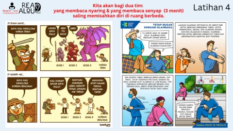 Kita akan bagi dua tim: Latihan 4 yang membaca nyaring & yang membaca senyap (3 menit) saling memisahkan diri di ruang berbeda.