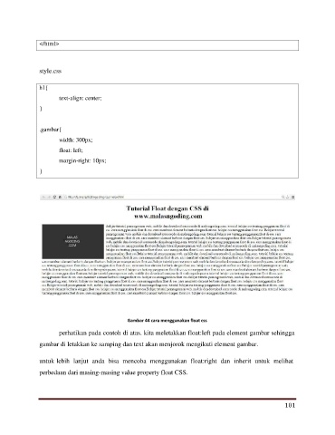 perhatikan pada contoh di atas. kita meletakkan float:left pada element gambar sehingga