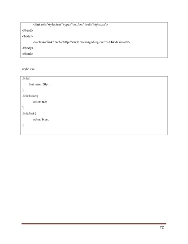 <link rel="stylesheet" type="text/css" href="style.css"> </head> <body> <a class="link" href="http://www.malasngoding.com">Klik di sini</a> </body> </html> style.css .link{ font-size: 20pt; } .link:hover{ color: red; } .link:link{ color: blue; } 72