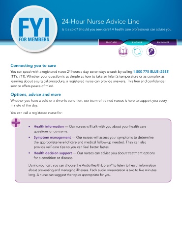 You can speak with a registered nurse 24 hours a day, seven days a week by calling 1-800-775-BLUE (2583)