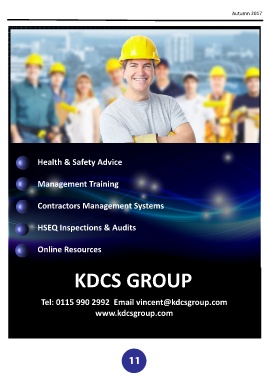 Autumn 2017 Health & Safety Advice Management Training Contractors Management Systems HSEQ Inspections & Audits Online Resources KDCS GROUP Tel: 0115 990 2992 Email vincent@kdcsgroup.com www.kdcsgroup.com 11