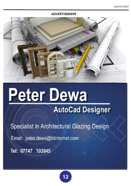 Autumn 2017 ADVERTISEMENT Peter Dewa AutoCad Designer Specialist in Architectural Glazing Design Email: peter.dewa@btinternet.com Tel: 07747 103945 12