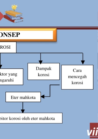 PETA KONSEP KOROSI Proses Jenis korosi Faktor-faktor yang Dampak Cara korosi terjadinya mempengaruhi mencegah korosi korosi Eter mahkota Inhibitor korosi oleh eter mahkota vii