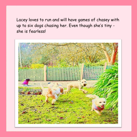 Lacey loves to run and will have games of chasey with up to six dogs chasing her. Even though she’s tiny - she is fearless! 8