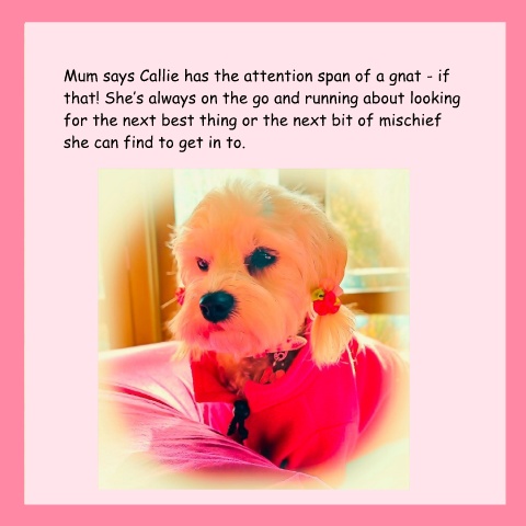 Mum says Callie has the attention span of a gnat - if that! She’s always on the go and running about looking for the next best thing or the next bit of mischief she can find to get in to. 9