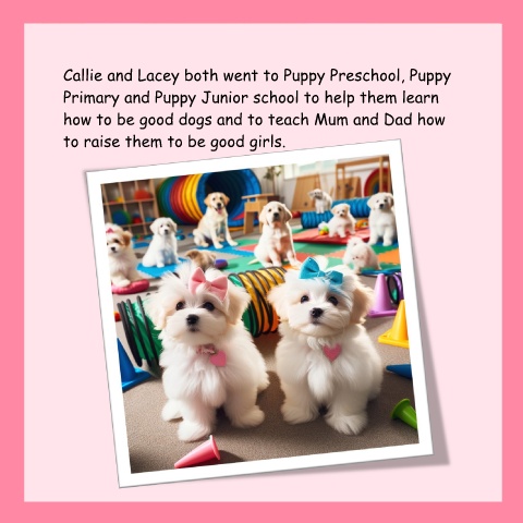 Callie and Lacey both went to Puppy Preschool, Puppy Primary and Puppy Junior school to help them learn how to be good dogs and to teach Mum and Dad how to raise them to be good girls. 18