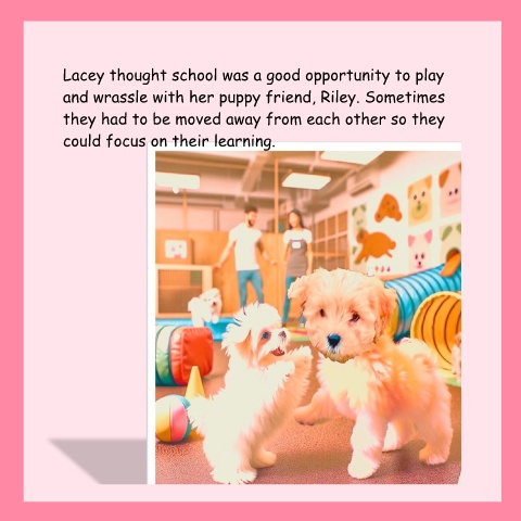 Lacey thought school was a good opportunity to play and wrassle with her puppy friend, Riley. Sometimes they had to be moved away from each other so they could focus on their learning. 19