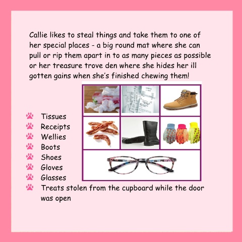 Callie likes to steal things and take them to one of