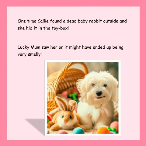 One time Callie found a dead baby rabbit outside and she hid it in the toy-box! Lucky Mum saw her or it might have ended up being very smelly! 3