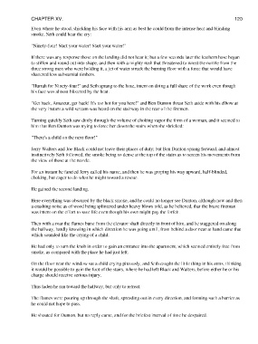 Then with a roar the flames burst from the elevator shaft directly in front of him, and he staggered on along