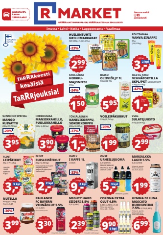 FLINTLEIP%u00c4TIKUT35g (17,14/kg) %u2022juusto%u2022m%u00e4ti%u2022pekoni%u2022rapuFLINT RUISLEIP%u00c4TIKUT80g (12,50/kg)%u2022mausteinen tomaatti%u2022nauta & adjika%u2022pekoni & piparjuuri%u2022valkosipuliONSEURHEILUJUOMA0,7l (2,09/l)PEACHY-MANGO TROPICAL BLUE LEMON-LIMEHinta sis. pantitOATLYI KAFFE 1L(1,50/l)kes%u00e4isi%u00e45951,65 kpl5,-6 kpl3 kpl9,-2,25 kpl1,99 kpl299pktP%u00d6LTSAMAAVAHVA SINAPPI65g (23,07/kg)2 kpl3,-Norm. 2,655 kpl3,-0,69 kplNorm. 9,50199MARSALKKALAGER 5.5% 0,5l (3,70/l)Hinta sis. pantin.Hinta voimassa3.6.2025 alkaenHERKKUMAAMANSIKKAHILLO,PUOLUKKAHILLO 960g (4,06/kg)2 kpl2,-1,29 kplBASSOOLIIVI%u00d6LJY 1L POMACE TINHUILUNTUHTIGRILLIMAKKARAT 320-400g (9,34-7,47/kg)-23%3,90 pkt1,-Norm. 1,59pssT%u00d6YS%u00c4L%u00c4INENKANELIKORPPU,SOKERIKORPPU200g (5,00/kg)KAVLI %u00c4KTAHERKKUMAJONEESI 310g150-24%1,-OLD EL PASOVEHN%u00c4TORTILLA8KPL/PKT MEDIUM SOFT 326g (3,07/kg)Norm. 1,75-42%VOILEIP%u00c4KURKUT530g (3,75/kg)199Norm. 2,49-20%-37%299Valio SULATEJUUSTO370g (8,08/kg)Norm. 3,29390Norm. 4,25kpl-33%GEMMA DI LUNA MOSCATOKUOHUVIINI7.5% 0,75l (9,84/l)699Hinta sis. pantin.Hinta voimassa30.6.2025 alkaenCORONA EXTRAOLUT 4.5% 0,33l (4,70/l) %u00e1 1,65Hinta sis. pantinHinta alk.1.1.202596 kpl901,65 kplMIGHTY HARDSIIDERI 5.5% 0,5l (4,48/l)239kplHinta sis%u00e4lt%u00e4%u00e4 pantinHinta 28.1.2025 alkaenNUTELLA630g (6,33/kg)Norm. 6,25399-36%PAULANER FC BAYERN VEHN%u00c4OLUT 5.5%0,5l (6,30/l) 330Norm. 3,95Hinta sis%u00e4lt%u00e4%u00e4 pantinHinta 30.6.2025 alkaenSUNSHINE SPECIALMANGOKUIVATTU200g (19,75/kg)Norm. 4,99-20%395Imatra %u2022 Lahti %u2022 Kotka %u2022 Lappeenranta %u2022 Vaalimaa Seuraa meit%u00e4@rmarket.fiAjokatu 81,Laune15500 Lahti