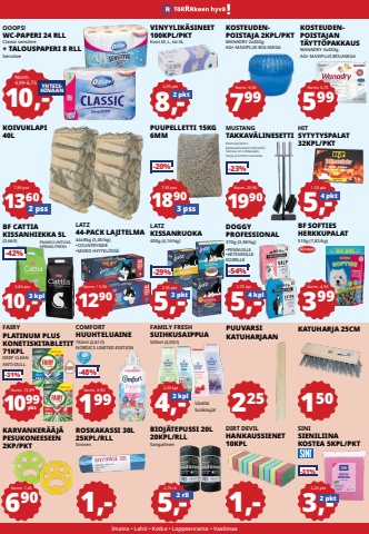 Imatra %u2022 Lahti %u2022 Kotka %u2022 Lappeenranta %u2022 Vaalimaa 4 kplNorm. 15,90125,-90KARVANKER%u00c4%u00c4J%u00c4PESUKONEESEEN2KP/PKTNorm. 8,95ROSKAKASSI 30L25KPL/RLLSininenVINYYLIK%u00c4SINEET100KPL/PKTKoot M, L, tai XLBIOJ%u00c4TEPUSSI 20L20KPL/RLLSangallinen3,-10,-PUUVARSIKATUHARJAAN3 kpl5,80 pss2,75 kpl690Norm. 7,455,-2 rll2,75 rll-42%-54%1099Norm. 15,99150FAIRYKATUHARJA 25CMPLATINUM PLUSKONETISKITABLETIT71KPLDEEP CLEANANTI-DULL1,-8,-2 pkt4,95 pkt225BF SOFTIESHERKKUPALAT 510g (7,82/kg) 399Norm. 4,90BF CATTIAKISSANHIEKKA 5L (0,66/l) PAAKKUUNTUVA,SPRING FRESHDOGGYPROFESSIONAL370g (3,38/kg) %u2022PENNUILLE%u2022AKTIIVISILLE KOIRILLELATZKISSANRUOKA400g (4,16/kg) 3 pkt5,-2,35 pktLATZ44-PACK LAJITELMA44x85g (3,45/kg)%u2022COUNTRYSIDE%u2022MIXED HYYTEL%u00d6SS%u00c4pkt199COMFORTHUUHTELUAINE762ml (2,61/l)NORDICS LIMITED EDITIONNorm. 3,90-48%FAMILY FRESHSUIHKUSAIPPUA500ml (4,00/l)2 kpl4,-2,59 kplDIRT DEVILHANKAUSSIENET10KPL1,-SINISIENILIINAKOSTEA 5KPL/PKT2,25 pkt2 pktOOOPS! WC-PAPERI 24 RLLClassic sensitive+ TALOUSPAPERI 8 RLLSensitiveYHTEISHINAAN10,-Norm. 4,99-6,75KOSTEUDENPOISTAJA 2KPL/PKT WANADRY 2x450gAG+ MAXIPLUS BOLASEGA799Norm. 9,50KOSTEUDENPOISTAJANT%u00c4YTT%u00d6PAKKAUS WANADRY 3x450gAG+ MAXIPLUS BOLASEGA599Norm. 6,75PUUPELLETTI 15KG 6MM18903 pss7,95 pssKOIVUKLAPI40L13602 pss7,99 pssHITSYTYTYSPALAT 32KPL/PKT5,-4 pkt1,50 pkt1990Norm. 25,90Kolmeosainen takkav%u00e4linesetti telineell%u00e4. Setiss%u00e4 on tuhkalapio, harja ja kohennusrauta.MUSTANGTAKKAV%u00c4LINESETTI-31%-23%-31%Useita tuoksuja!-29%-20%