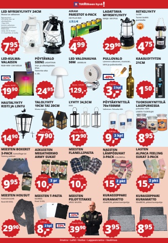 1,09 kplAIKUISTENMEGATHERMO ARMY SUKATImatra %u2022 Lahti %u2022 Kotka %u2022 Lappeenranta %u2022 Vaalimaa TALOLYHTY19CM TAI 20CM Musta metalliLED VALONAUHA 50M 40000LMPULLOVALOL%u00e4mmin valkoinen, moniv%u00e4ri, t%u00e4hti ja pullonkorkki2,50 kpl10,-3 pr3,99 pariTUOKSUKYNTTIL%u00c4LASIPURKISSA paloaika 100hUSEITA TUOKSUJA!790LYHTY 34,5CMESSINorm. 9,9019901290129,-P%u00d6YT%u00c4VALOSIENI LADATTAVASis%u00e4- ja ulkok%u00e4ytt%u00f6%u00f6n.IP44. Toiminta-aika n. 8h.2495KAASUSYTYTIN 21CM150Norm. 149,00995NAISTEN L%u00c4MP%u00d6SUKAT3-PACK COLORFULLASTENALPACA FEELINGSUKAT 3-PACK3,-2 kplMIESTENFLANELLIPAITA9,-MIESTEN BOXERIT3-PACK Camoflage taiTommy edition15,-2 pkt7,99 pkt10,-Norm. 12,9015,-2 pkt7,99 pktNorm. 15,90P%u00d6YT%u00c4KYNTTIL%u00c470x150MMValkoinen. Paloaika 66h3 kpl895LED-KULMAVALAISINRGB+WW 12W 500LM-42%Norm. 34,903,90 kpl29908,-3990395895MIESTENPILOTTITAKKI VROC MUSTANorm. 59,90-33%MIESTEN T-PAITANORRISKoot S-XXL2 kpl5,99 kpl-33%MIESTEN HOUSUTFLEECEVUORIKoot M-XXXLKURASIEPPARIKURAMATTO40x60CM, pit%u00e4v%u00e4 kumipohjaKURASIEPPARIKURAMATTO50x80CM, pit%u00e4v%u00e4 kumipohjaHAUTALYHTYRISTI JA LINTU 1490475RETKILYHTY3x3WToimii 3xAAAparistoillaRetromainen LED-lyhty sis%u00e4- tai ulkok%u00e4ytt%u00f6%u00f6n. 15kpl LED, l%u00e4mmin valkoinen. S%u00e4%u00e4dett%u00e4v%u00e4 kirkkaus. Materiaali: rauta, lasi & muovi. 2 x D-paristo, ei sis%u00e4lly.LED MYRSKYLYHTY 24CM Musta tai valkoinen795kpl2990LADATTAVA MYRSKYLYHTY MAIJA 6W IP44AIRAMPARISTOT 6-PACK HD PLUS R20499Norm. 5,75-40%