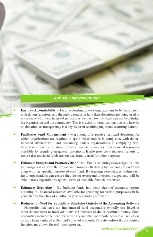 expenses. Funds can be thought of as mini organizations within the organization as a ► Reduces the Need for Subsidiary Schedules Outside of the Accounting Software