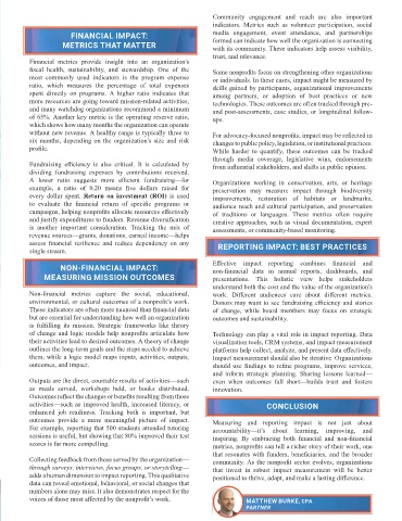 MEASURING AND REPORTING IMPACT: environmental, or cultural outcomes of a nonprofit’s work. Donors may want to see fundraising efficiency and stories