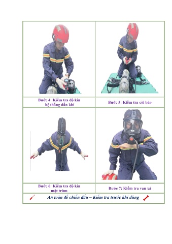 Bước 4: Kiểm tra độ kín Bước 5: Kiểm tra còi báo hệ thống dẫn khí Bước 6: Kiểm tra độ kín Bước 7: Kiểm tra van xả mặt trùm An toàn để chiến đấu – Kiểm tra trước khi dùng
