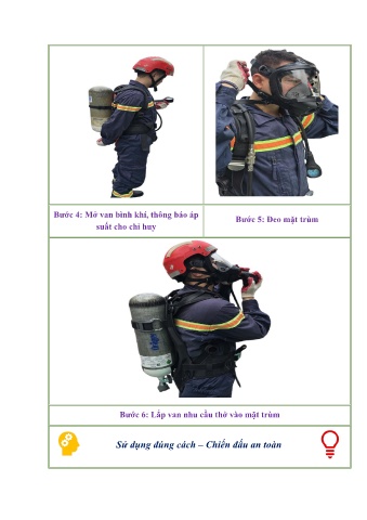 Bước 4: Mở van bình khí, thông báo áp Bước 5: Đeo mặt trùm suất cho chỉ huy Bước 6: Lắp van nhu cầu thở vào mặt trùm Sử dụng đúng cách – Chiến đấu an toàn