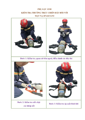 PHỤ LỤC ẢNH KIỂM TRA THƯỜNG TRỰC CHIẾN ĐẤU ĐỐI VỚI MẶT NẠ SPASCIANI Bước 1: Kiểm tra, quan sát bên ngoài, điều chỉnh các dây đai Bước 2: Kiểm tra xiết chặt Bước 3: Kiểm tra áp suất bình khí các khớp nối